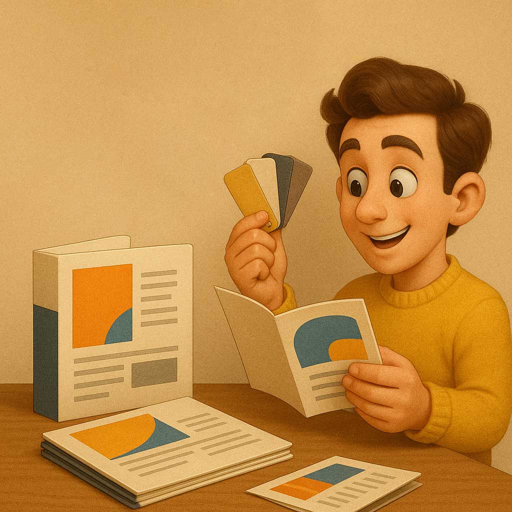 کاغذ: گلاسه ۱۳۵–۲۰۰ گرم برای رنگهای زنده؛ تحریر برای متنمحور؛ کرافت برای حس طبیعی.
